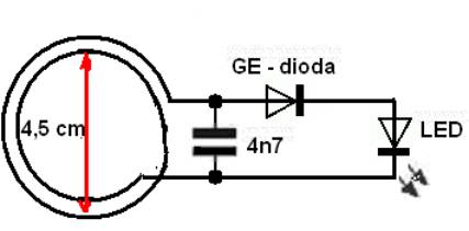 Přijímač je opět velmi jednoduchý, je to v podstatě krystalka, jejíž cívka laděného obvodu slouží jako přijímací anténa, a místo sluchátek (nemodulované vysílání by stejně nebylo slyšet) má připojenu světelnou diodu (LED) která svým rozsvícením signalizuje příjem elektromagnetických vln.