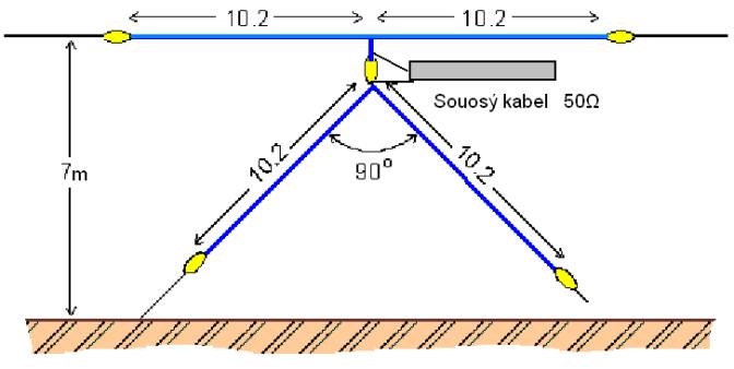 Anténa je zhotovena z měděného lanka nebo plného vodiče o průměru 3 – 4 mm. V jejím středu je připojen střední vodič napájecího kabelu (doporučuji zakroutit a připájet). Je velmi vhodné vést kabel alespoň pár metrů kolmo k dipólu. Jako střední izolátor použijeme destičku sklolaminátu, PVC, nebo plexiskla silnou alespoň 10 mm. Na této destičce je pomocí příchytky upevněn napájecí kabel, jehož vnější vodič (stínění) je připojeno k dolní části antény typu invert V, střední vodič k horní části. Vnější konce obou větví jsou upevněny na závěsech přes vajíčkové izolátory, doporučuji je použít po dvou, pro případ deště nebo námrazy, která je vodivá.